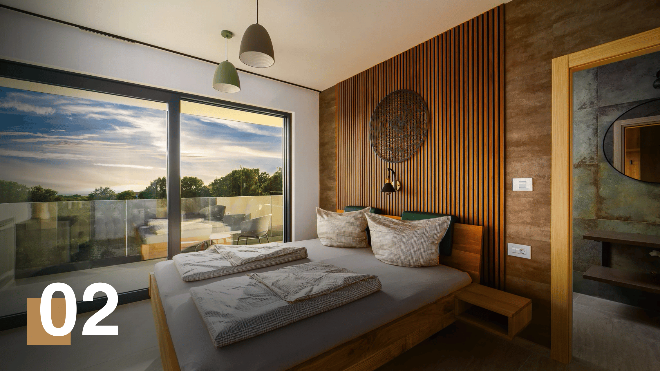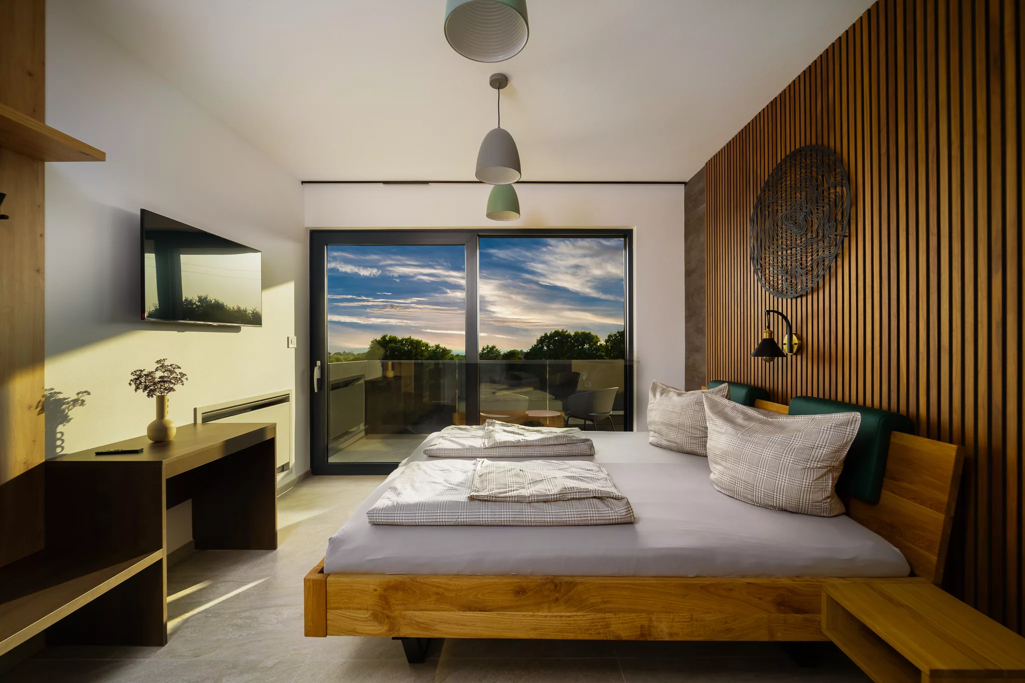 Alle Zimmer verfügen über Flachbildfernseher, großzügige Schränke und Zugang zu einer eigenen Terrasse, die einen herrlichen Ausblick auf die Natur ermöglicht.