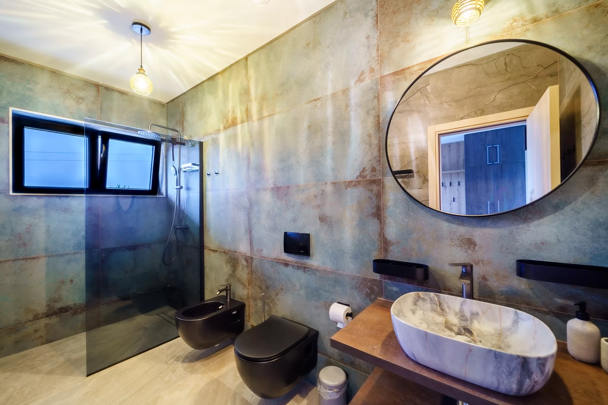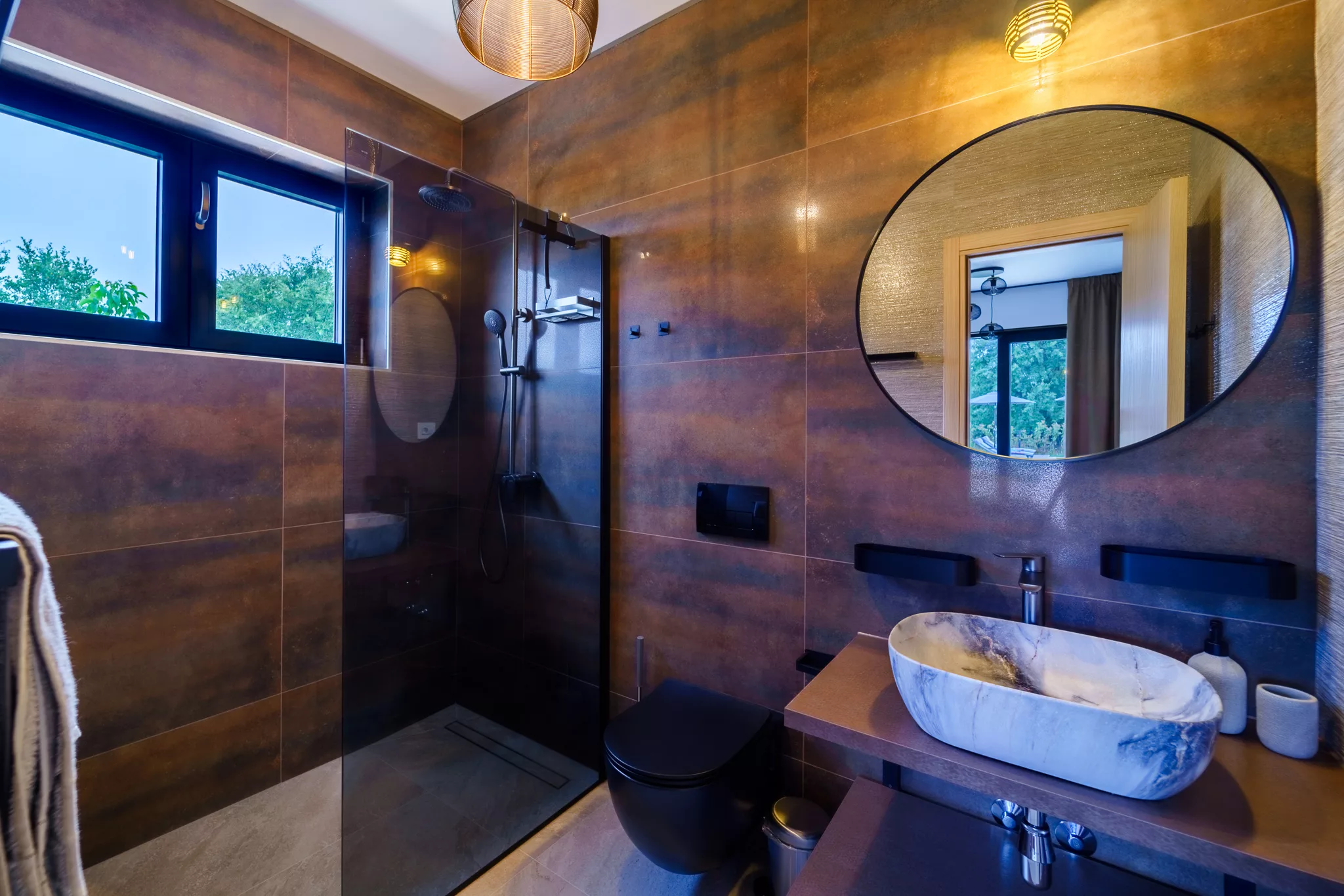 Jedes Schlafzimmer hat sein eigenes, modern ausgestattetes Badezimmer mit begehbarer Dusche und hochwertigen Armaturen.