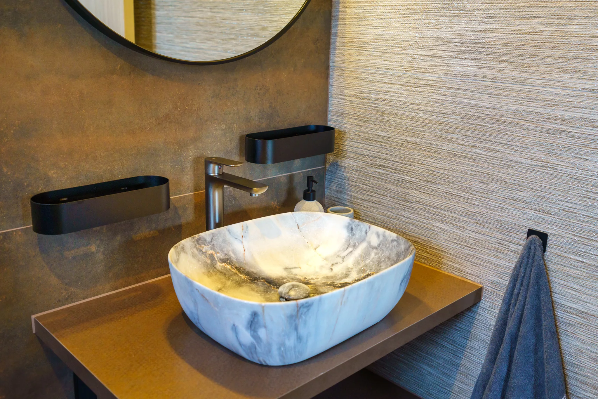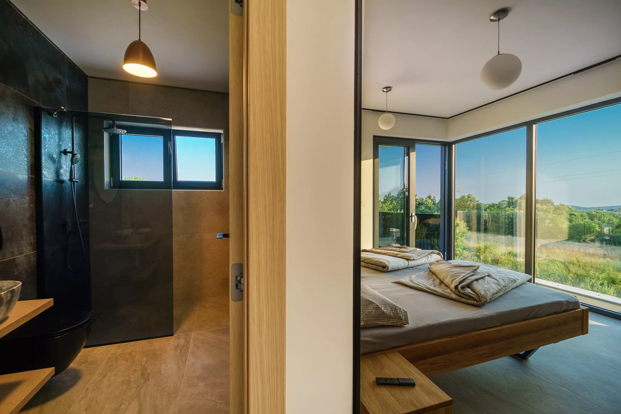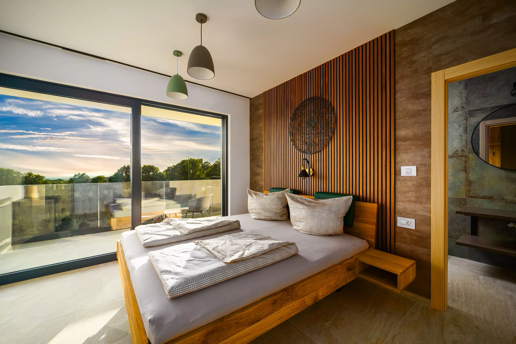 Jedes Schlafzimmer hat sein eigenes, modern ausgestattetes Badezimmer mit begehbarer Dusche und hochwertigen Armaturen.