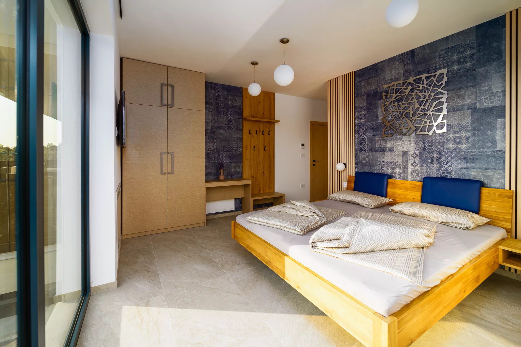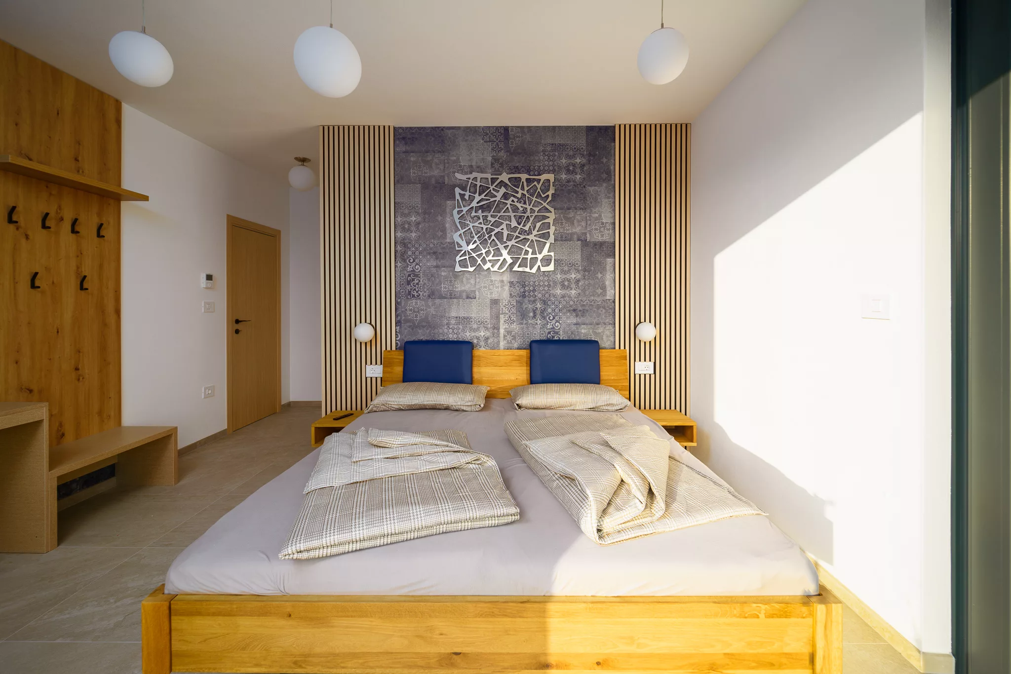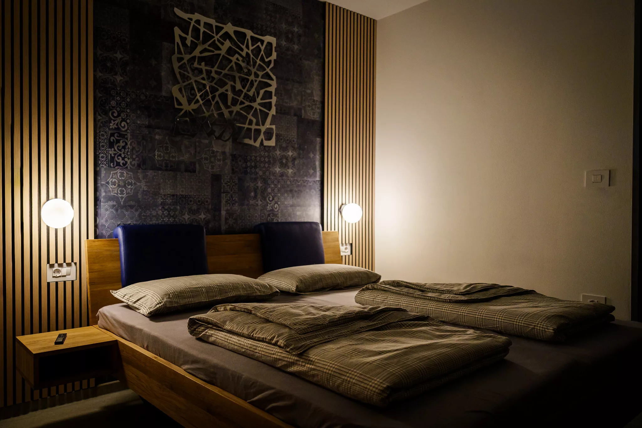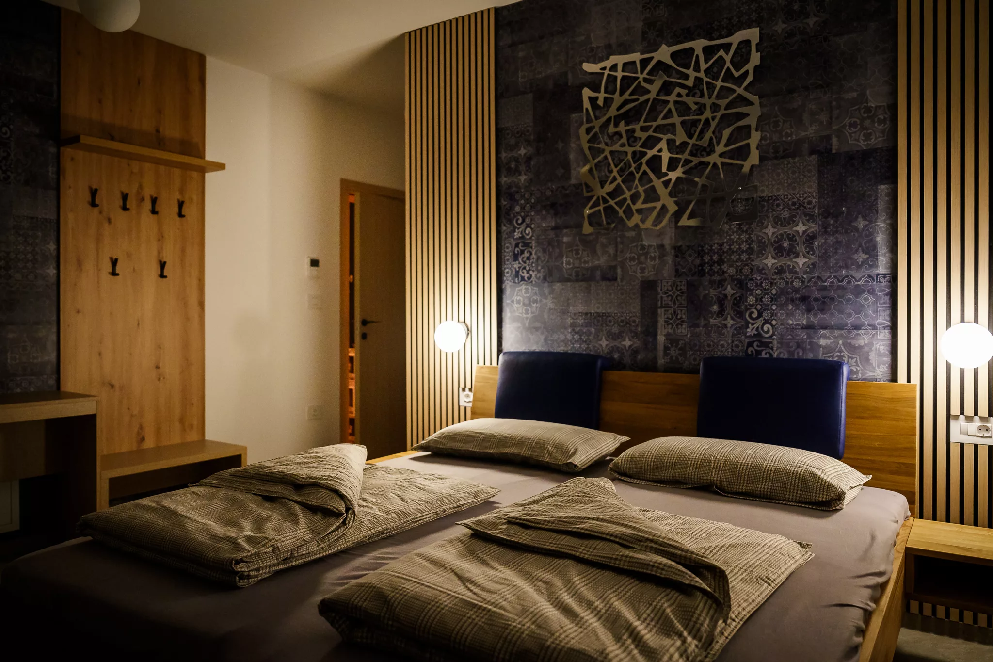 Doppelbett (mind. 1,50 x 2 m) • Abdunklung • Aufbewahrung von Kleidung • Bettwäsche • extra Kissen und Decken • Grundausstattung • Heizung • Kleiderbügel • Klimaanlage • TV • Arbeitsplatz • Föhn