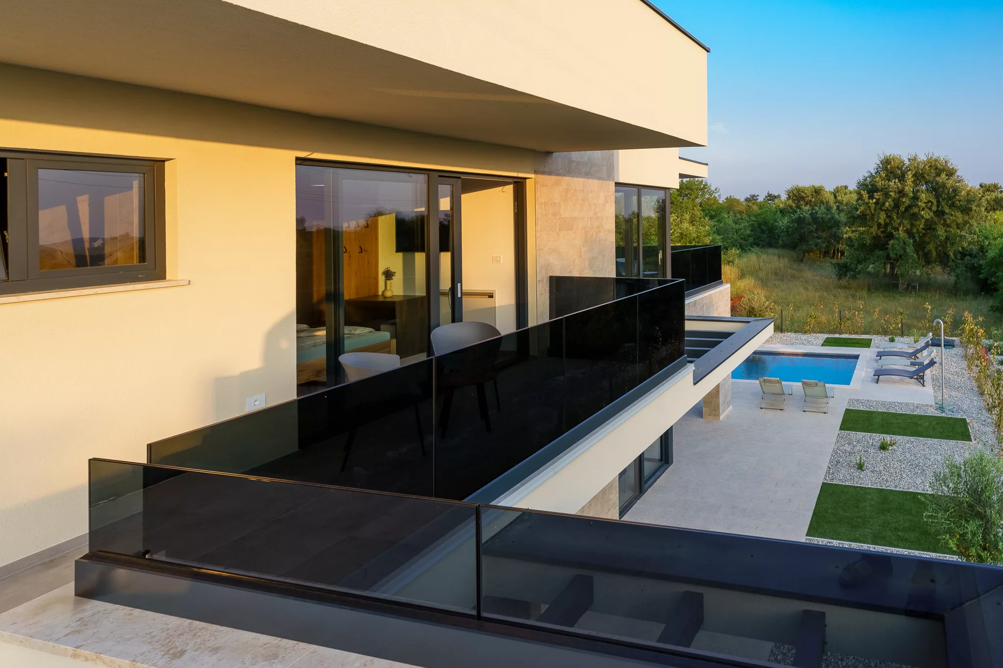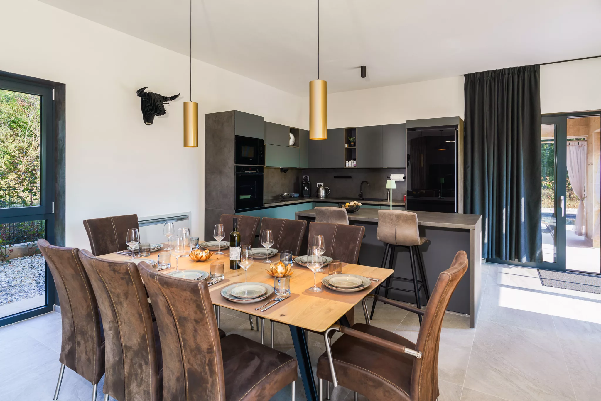 Große Fensterflächen durchfluten das Haus mit natürlichem Licht und bieten spektakuläre Ausblicke auf die umliegende Landschaft.