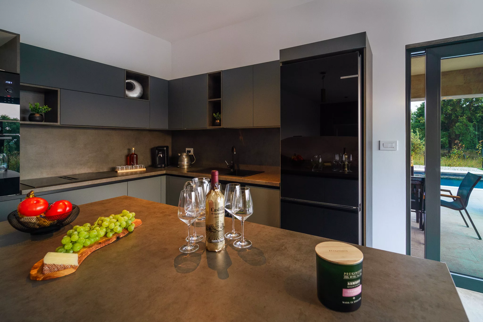 Esstisch • Heizung • Klimaanlage • Weingläser • Abdunklung • am Wasser • Backblech • Brettspiele • Brotbackautomat • Bügeleisen • Erste-Hilfe-Set • Essbereich im Freien • Gefrierschrank • Gartenmöbel • Ge­schirr­spül­ma­schi­ne • Geschirr und Besteck • Grill • Grillbesteck • Grundausstattung zum Kochen • Herd • Hinterhof/Garten • Kaffee • Kaffeemaschine • Kochnische